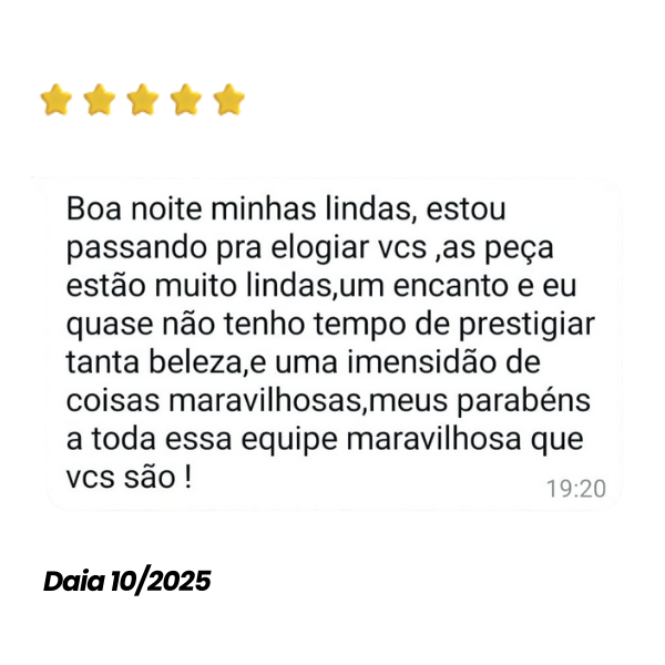 “Vocês são demais! É mais lindo ainda pessoalmente, amei! Obrigada pelo atendimento e pelo carinho.”