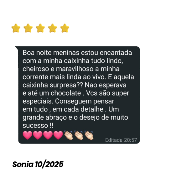 “Amei os brincos, as correntes e o capricho da embalagem. Parabéns!”